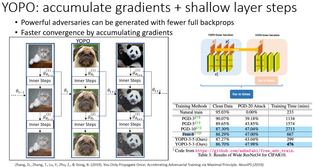 ),一般是这些梯度的平均值。这种做法有点类似于通过增大batch size的方式来加快模型的收敛。YOPO训练速度比其他对抗训练方式要快很多,准确率相比FreeAT也有提升,同时也提升了模型的鲁棒性 ( 防御攻击能力 )。最后文章并未指出通用的规则来表示具体减少的循环次数,只是发现用了更少的循环次数,得到了更好的结果。