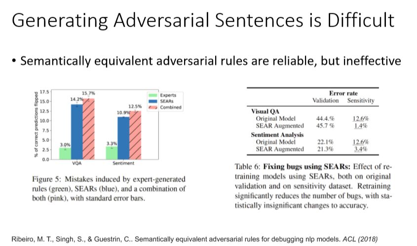 这种语义等价对抗规则产生的对抗样本基本上保留了原义,但不是一种非常有效的攻击方式,从实验中我们可以看到SEARs在数据集Visual QA和Sentiment Analysis上产生对抗样本的准确率最低只降到10.9%,这点跟之前提到的图像对抗攻击不同,在图像上对没有经过对抗训练的模型准确率能够降底到0。实验证明SEARs对抗训练在数据集上的准确率表现也一般,而且也只能有限降低抵抗对抗样本的敏感性。
