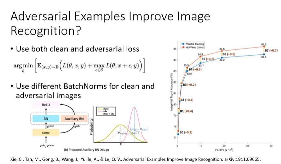 但是,近期来自JHU和Google的一篇文章中提出一种对抗训练方法,能够提升模型在干净样本测试集上的准确率。和前文所述Madry等人的训练方法不同,其损失函数同时包含了干净样本和对抗样本,并且对干净样本和对抗样本分别使用两组不同的Batch Normalization。作者们通过对比干净样本和对抗样本的Batch Normalization的参数,发现二者概率分布不同,所以在训练过程中对干净样本和对抗样本分别采用了不同的Batch Normalization。预测时,只使用干净样本对应的BatchNormalization参数,最终在ImageNet数据集上将Efficient Net的TOP1的准确率最高提升了0.7个百分点,并且在数据越大的情况下提升越明显。这给我们提供了一个使用对抗训练来提升模型准确率的一种方式。