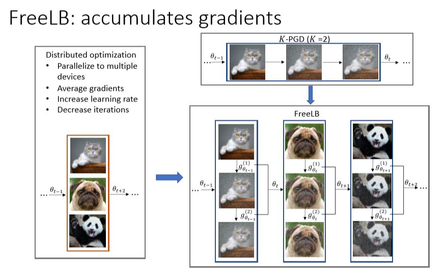 在我们的实验中,就借鉴了YOPO的对抗训练方式,但我们摒弃了YOPO提倡的inner step步骤。这样,我们的模型只在K步梯度上升的过程中积累梯度,并在之后用积累的梯度进行参数更新。这与并行优化非常类似,如左图所示,并行优化会将3个图片分别放在了3个GPU上进行训练,同时各自计算梯度,然后计算三个图片的平均梯度,这样batch size相当于原来的的3倍,模型训练时的learning_rate也可以增加到原来的3倍,但总迭代次数可以减少到原来的1/3,并且往往能达到同样的效果。自然语言理解任务,尤其是GLUE上所需要的迭代次数一般较少,所以与之不同的是,我们没有将总迭代次数 ( 模型参数更新次数 ) 减少到原来的1/K,但这种方式相比于K-PGD仍然提高了梯度的利用率,并能够进一步提升模型性能。