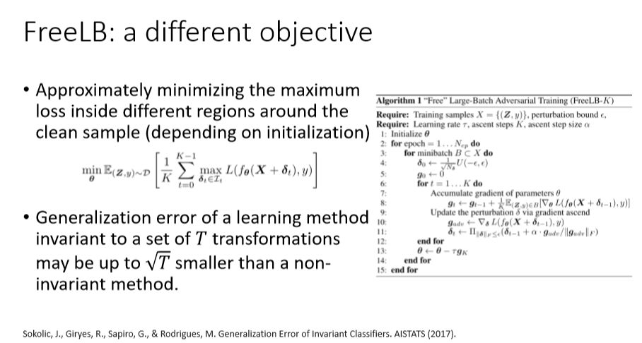 之前提到我们把生成的对抗样本加入到了模型的输入中,相当于增加了数据的batch size,目标函数可以看成最大化对抗样本的损失函数在某个邻域内的值,当有K个对抗样本时,相当于优化了在原来输入样本附近的K个不同区域的最大loss值。最后对目标函数求最小值来优化求解模型的参数,进行预测。我们的方法确实有一定的提升,但是背后的原因目前还没有去进一步证明,有文章指出