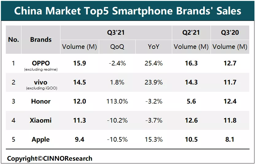 CINNO分析主要原因有两个方面:一方面因市场等待三季度新机发布,市场对安卓机持观望态度,消费需求延后;另一方面因去年疫情之后市场快速复苏带来的同期高基数。随着苹果新品 iPhone13 系列及其他安卓新机的陆续上市,叠加 “11·11” 促销季的到来,四季度有望达全年销量高峰。