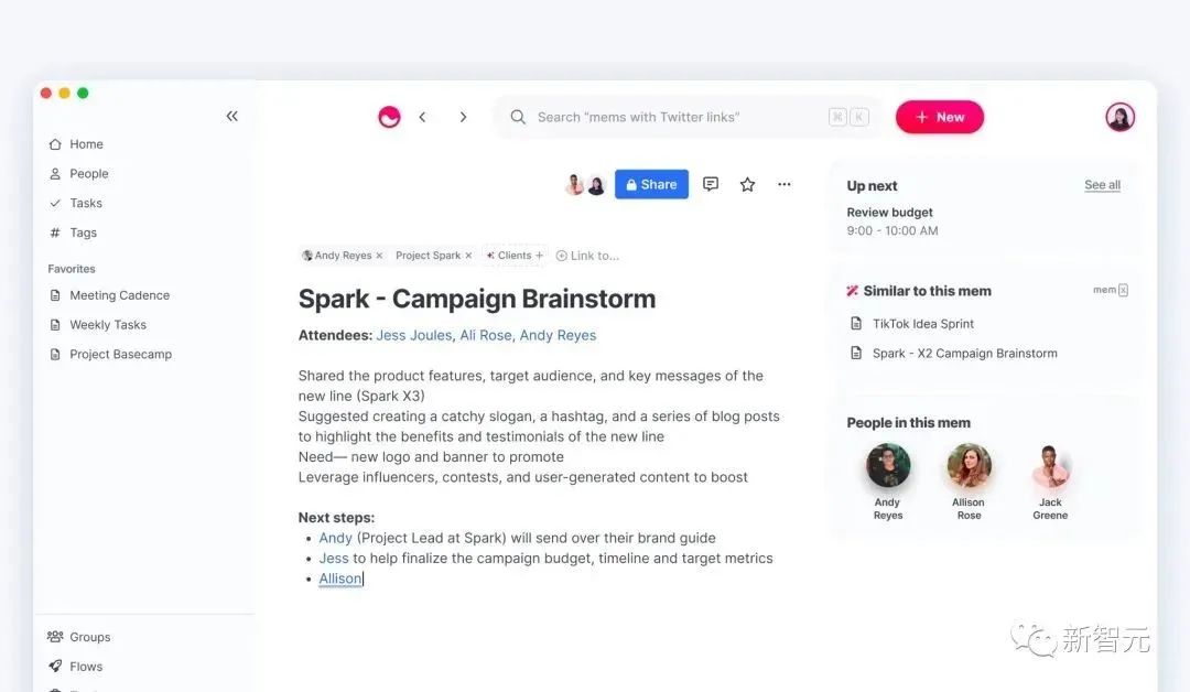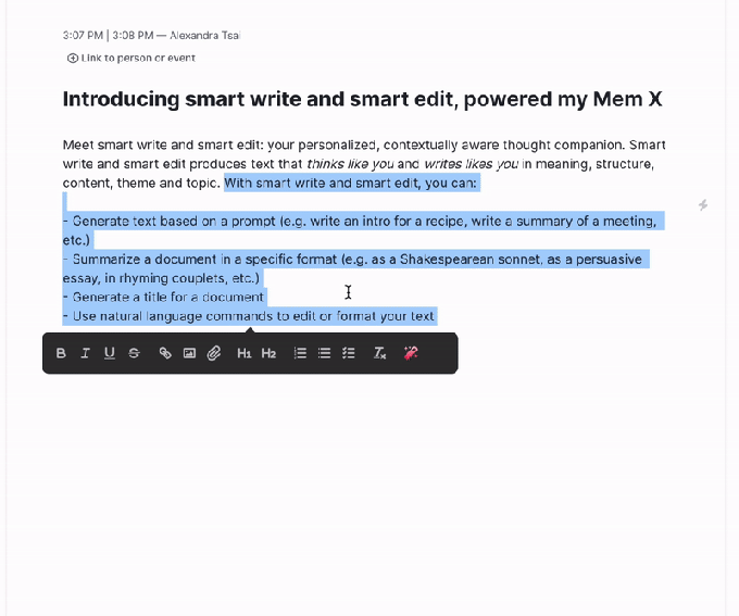 Mem的内置工作助手Mem X也得到进一步完善,增添了智能写作和智能编辑等新功能,利用人工智能根据提示生成文本,总结文件,为文件生成标题,并让用户使用自然语言命令来编辑或格式化文本。