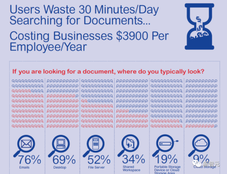 毫无疑问,对知识的搜索是很耗时的。根据外国研究机构的数据,专业人士要花50%的工作时间来搜索信息,平均需要18分钟才能找到一个文件。