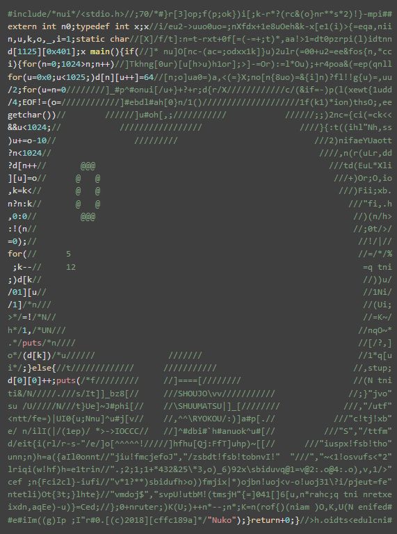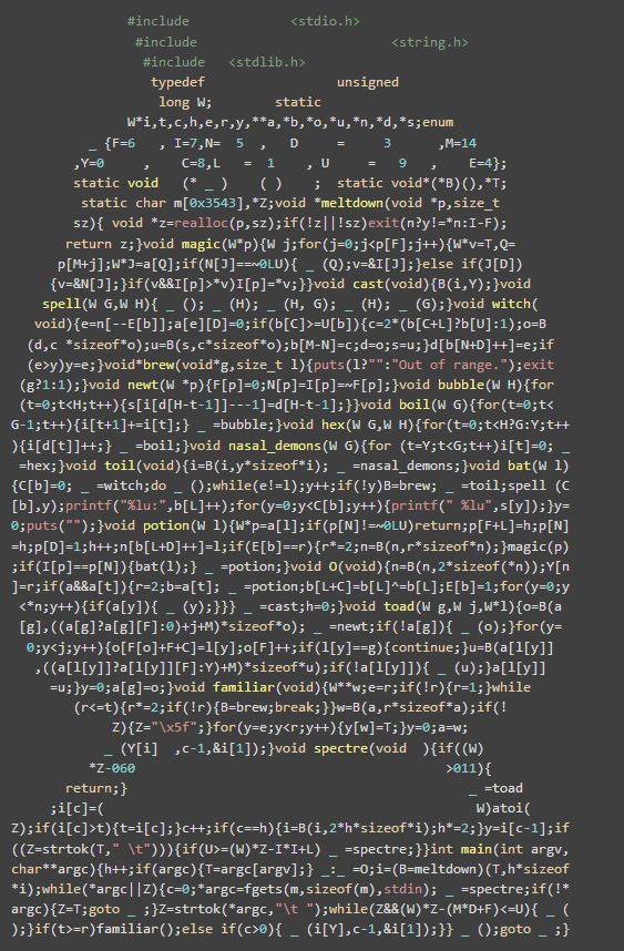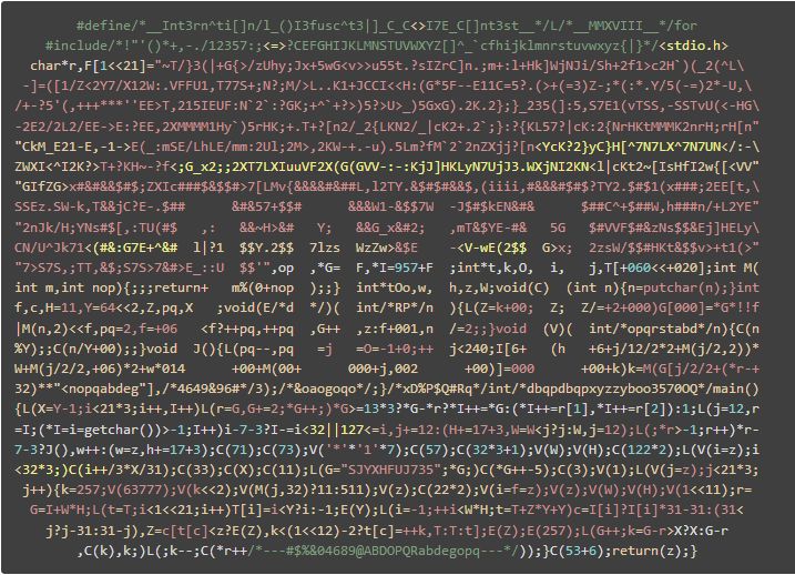 25 届国际 C 语言混乱代码大赛日前已成功举办,并公布获奖作品名单和代码。国际 C 语言混乱代码大赛(IOCCC, The International Obfuscated C Code Contest)是一项国际编程赛事,目的是写出最有创意的最让人难以理解的 C 语言代码,并限制在 4 kilobytes 以内。