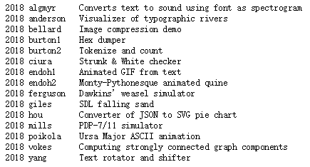 之前常在该比赛中拿奖的浙大教授侯启明和 Google 的 Don Yang 再次获奖。侯启明这次写了一个 JSON 转 SVG 饼状图的转换器,这也是他第 5 次获奖。Don Yang 则是第 8 次拿奖,写的是一个文本翻转和移位器(Text rotator and shifter)。