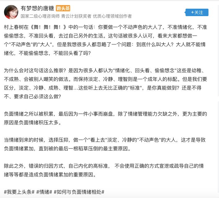 从这个角度讲,请不要像发布微博和朋友圈一样发微头条,记录自己的一日三餐、生活琐事等。偶尔发一发可以,但是这部分内容不应该成为你微头条内容的主体。因为读者可能关注名人、明星等的生活日常,但对普通人的碎碎念无感。