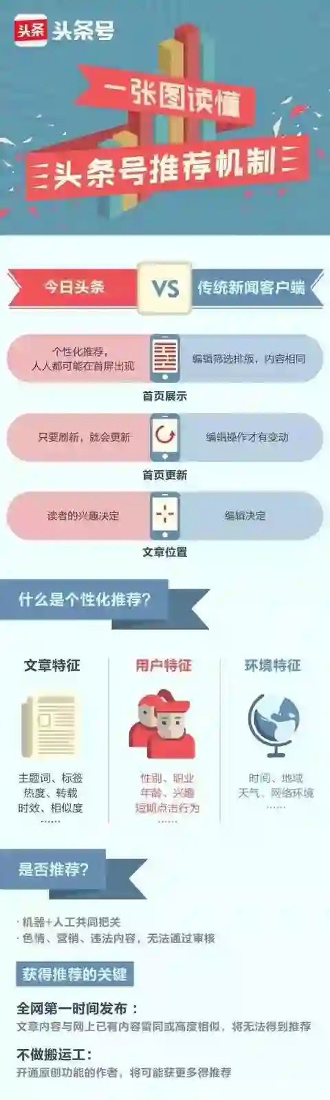分享今日头条算法架构师项亮的推荐机制解析文章,这篇文章解析了头条机器推荐的过程:怎样让文章在今日头条获得更多的推荐?官方有 3 点建议