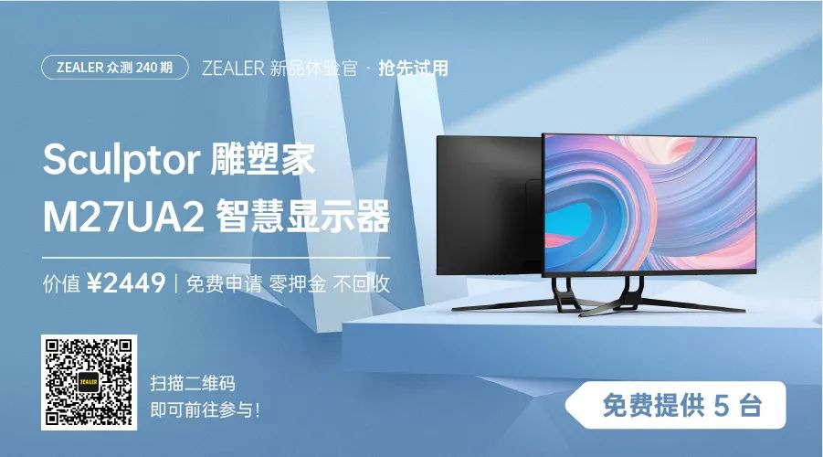 内置安卓系统,还能下百款 APP 当 iPad 用的 4K 显示器,你见过吗?雕塑家 M27UA2 智慧显示器上线 ZEALER 众测!配备 4K 高配臻彩屏 + HDR 高动态范围,画面自然生动更清晰;搭载 6 核 CPU + 独立 GPU 旗舰内核,系统体验丝滑流畅;还有震撼全景音效、无线 Wi-Fi 6、支持 65W 供电的全功能 C 口...想知道体验如何?扫上方二维码或戳左下角「阅读原文」即可前往参与。