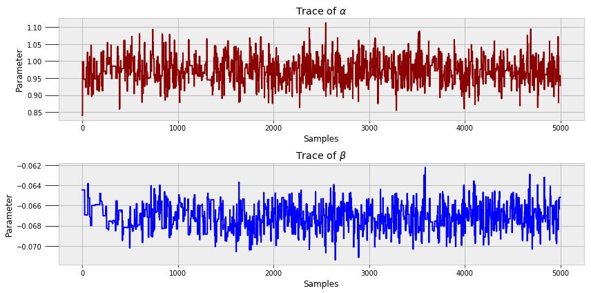 为了了解运行此代码时发生的情况,我们可以查看模型运行过程中生成的 α 和 β 的所有值。
