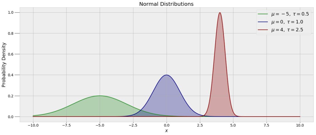 为了绘制 α 和 β 的随机值,我们需要假设这些值的先验分布。由于我们对参数没有任何提前的假设,我们可以使用正态分布。正态分布也称高斯分布,它由均值和方差定义,分别显示数据的位置以及扩散情况。下图是具有不同均值和方差的几种正态分布: