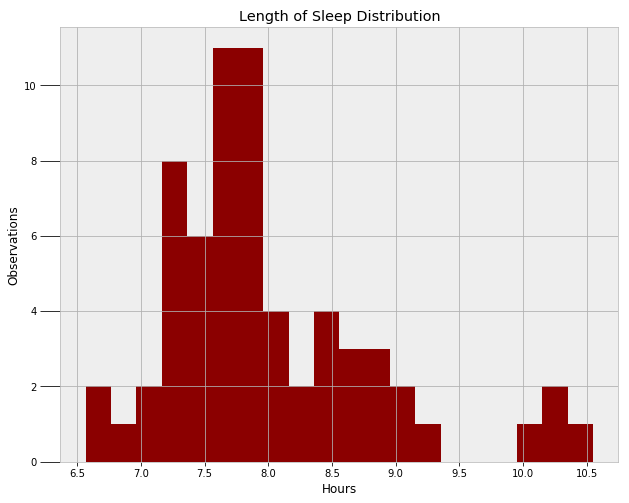 出于好奇心和练习目的,我最终想创造的是关于我睡眠时长的模型。首先,我们需要找到一个函数来模拟数据的分布。我猜想结果应该会是正态分布的形式,但是我们只有通过检查数据才能得到最终结果。