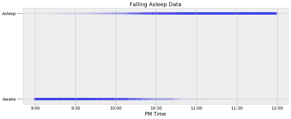 上图中,每个数据点都用点表示,点的强度显示在特定时间的观测数量。我的手表只能记录我入睡的那一分钟,所以为了扩大数据量,我在精确时间的两边增加以分钟为单位的数据点。举例而言,如果我的手表显示我在晚上 10:05 入睡,那么 10:05 之前的每一分钟都被表示为 0(清醒),10:05 之后的每一分钟都被表示为 1(睡着)。这将大约 60 个夜晚的观测数据扩展到了 11340 个数据点。