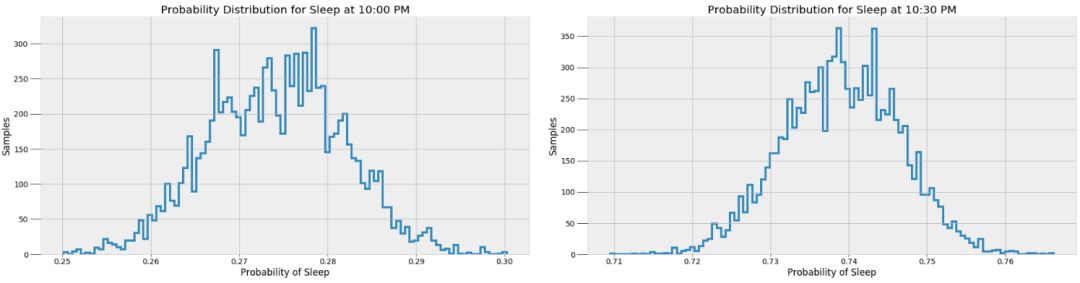 在数据给定的情况下,这些值是最有可能的估计值。然而,因为模型本身是近似的,所以存在与这些概率相关的不确定性。为了表示这种不确定性,我们可以使用所有的 α 和 β 样本(而不是它们的平均值)来预测某一给定时间的睡眠概率,然后据此绘制直方图。
