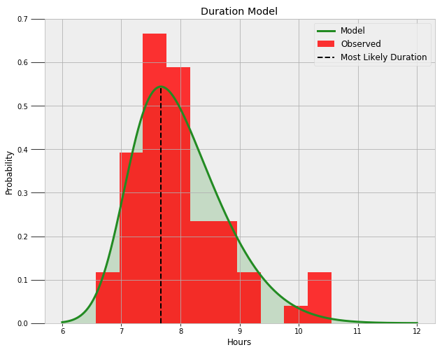 看起来拟合得不错!我们可以通过查询模型,找到我至少可以获得一定睡眠时长的概率,同时也能找到最可能的睡眠时长: