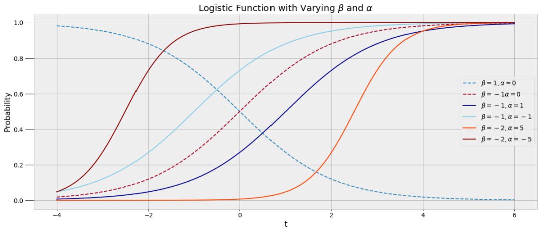 其中,β 和 α 是我们在 MCMC 过程中必须学习的模型参数。具有不同参数的 logsitic 函数图像如下所示。