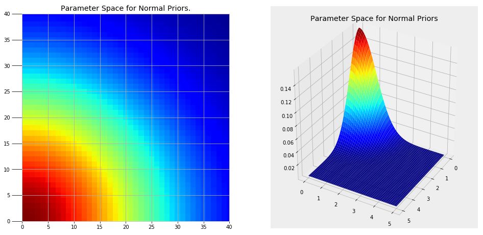 马尔科夫链蒙特卡罗方法分为两部分。蒙特卡罗指的是使用重复随机样本获得数值解的一般性技术。蒙特卡罗可以被视为进行了若干次实验,其中每次都对模型中的变量进行改变并观察其响应。通过选择随机数,我们可以探索大部分参数空间,即变量可能值的范围。下图显示了我们的问题使用正常先验后的参数空间。