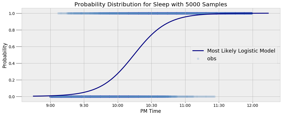 logsitic 函数很适合本案例中的数据,因为入睡的可能性会逐渐转变,此函数能捕捉睡眠模式之中的变化情况。我们希望能够在函数中插入时间 t,获得睡眠概率(其值在 0 和 1 之间)。我们最终得到的不是在晚上 10:00 入睡与否的直接答案,而是一个概率。为了建立这个模型,我们使用这些数据,通过 MCMC 寻找最佳的 α 和 β 参数。