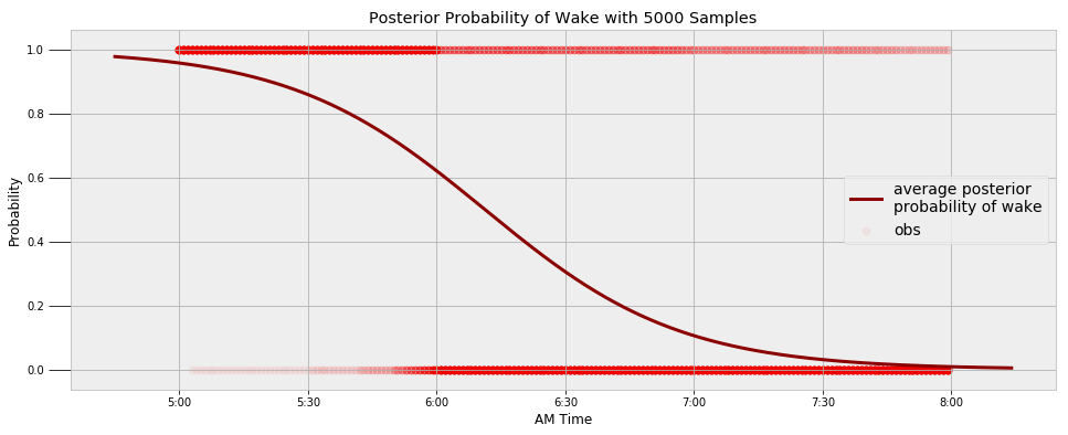 最终建立并运行模型之后,是时候使用结果了。我们将最后 5000 个 α 和 β 样本的平均值作为参数最可能的值,这就让我们能够创建一条曲线,建模睡眠后验概率: