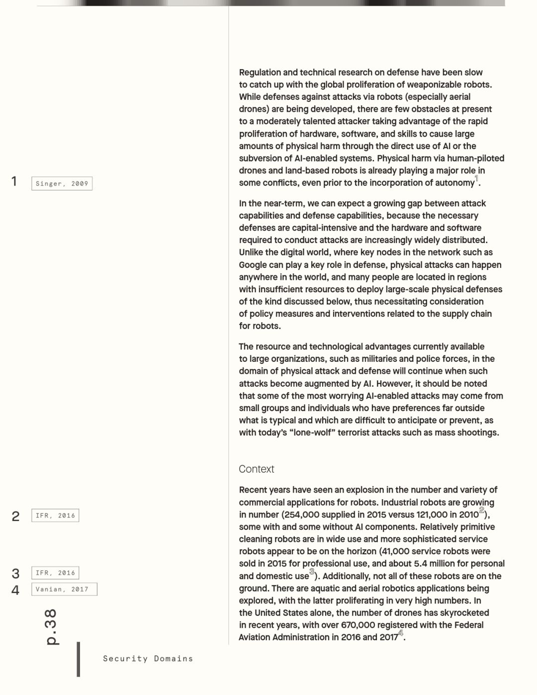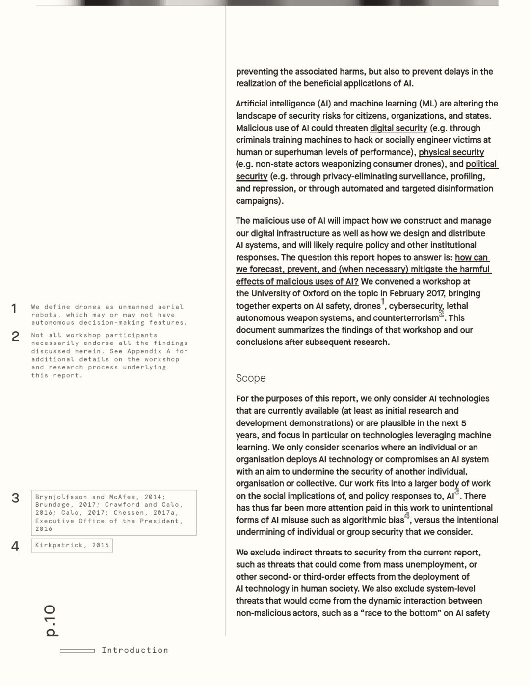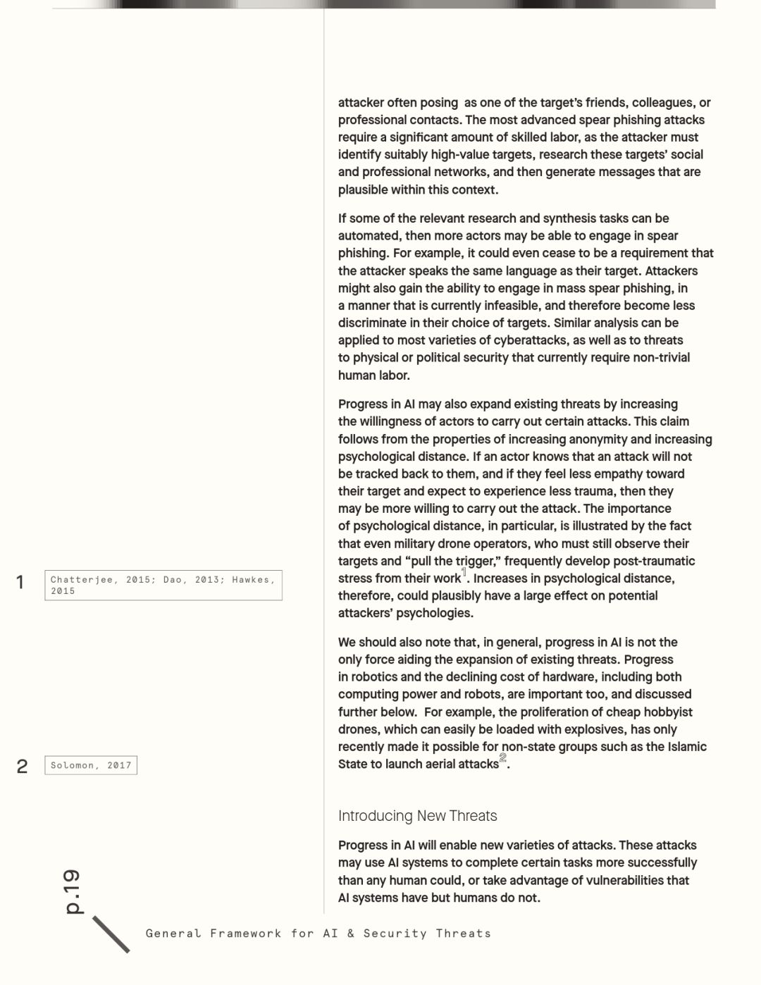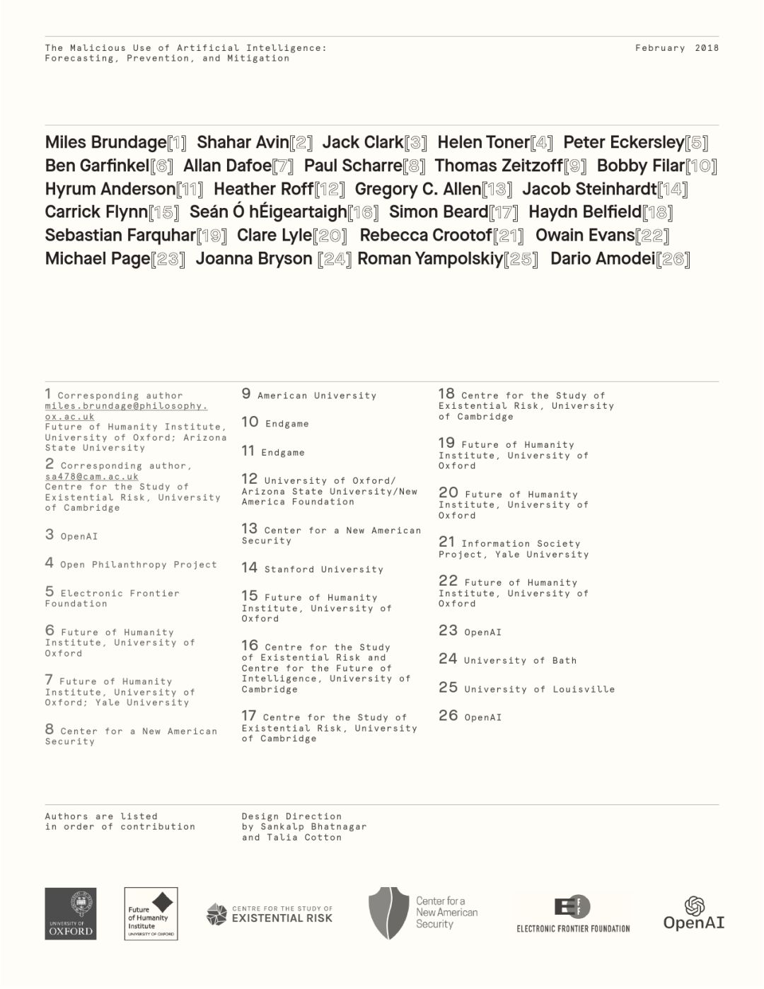 "我们都同意人工智能有很多正面的应用," 剑桥大学的"人类生存研究中心" 学者布伦达格(Miles Brundage)说道,"但是在不当使用人工智能会造成什么后果这个方面,论述显然很少。"
