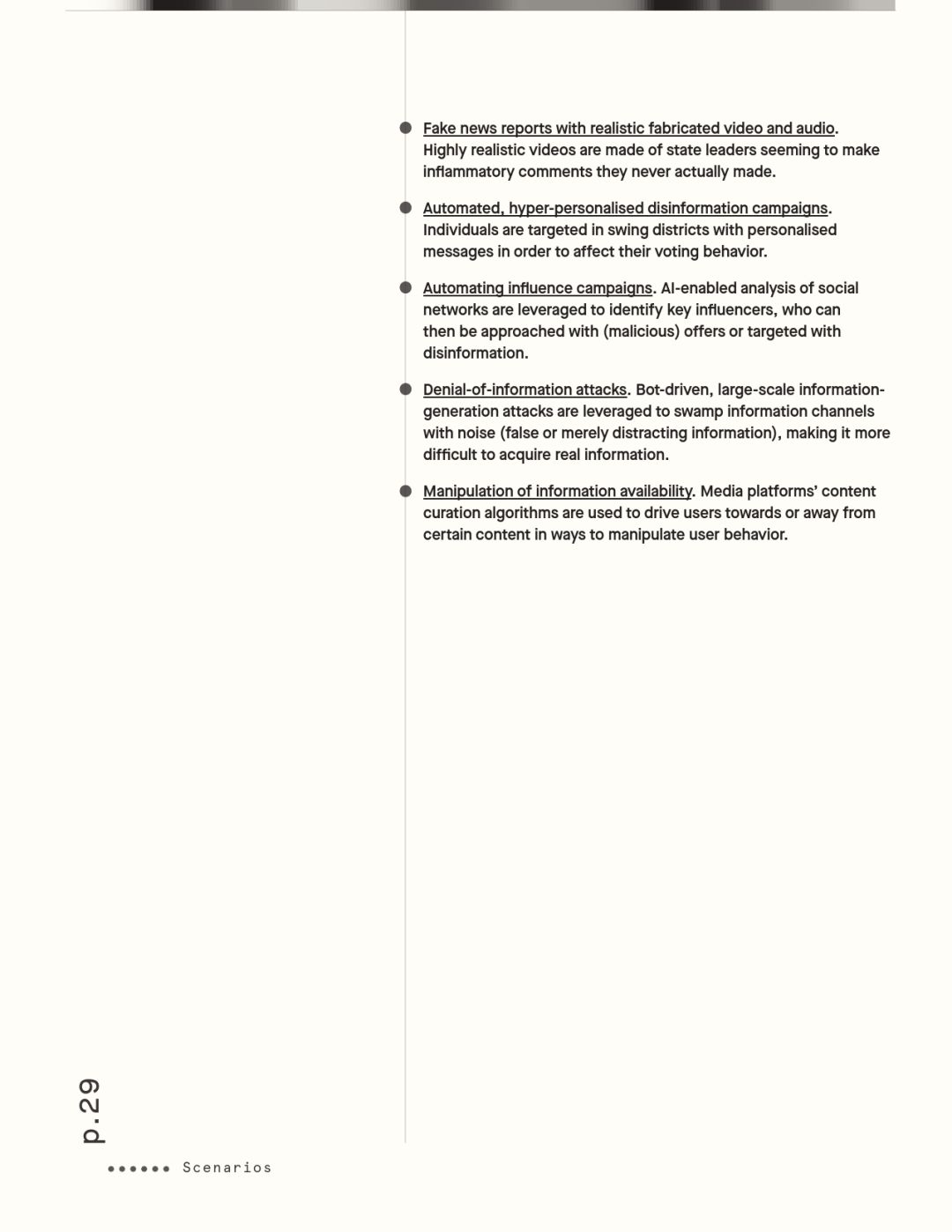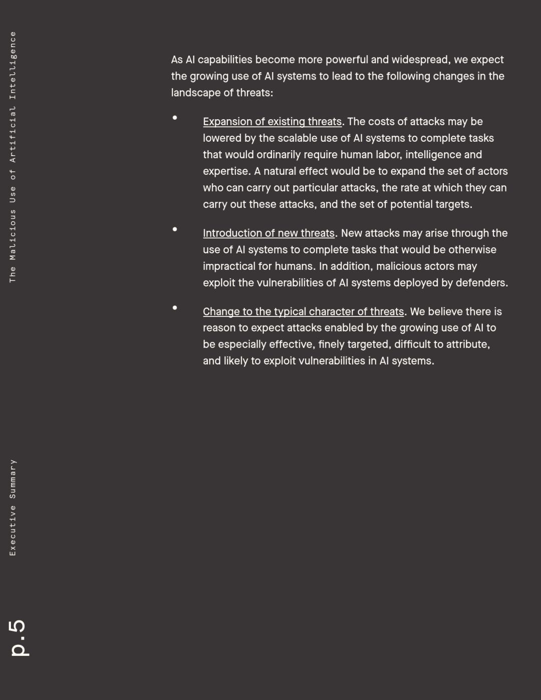 报告中提到,人工智能一旦被恶意操作,它能够采取大规模的高精准锁定攻击,不管是资讯的还是政治的安全都会面临即刻的威胁。报告中特别强调,这些是针对该领域未来五年内可能的发展所下的结论。