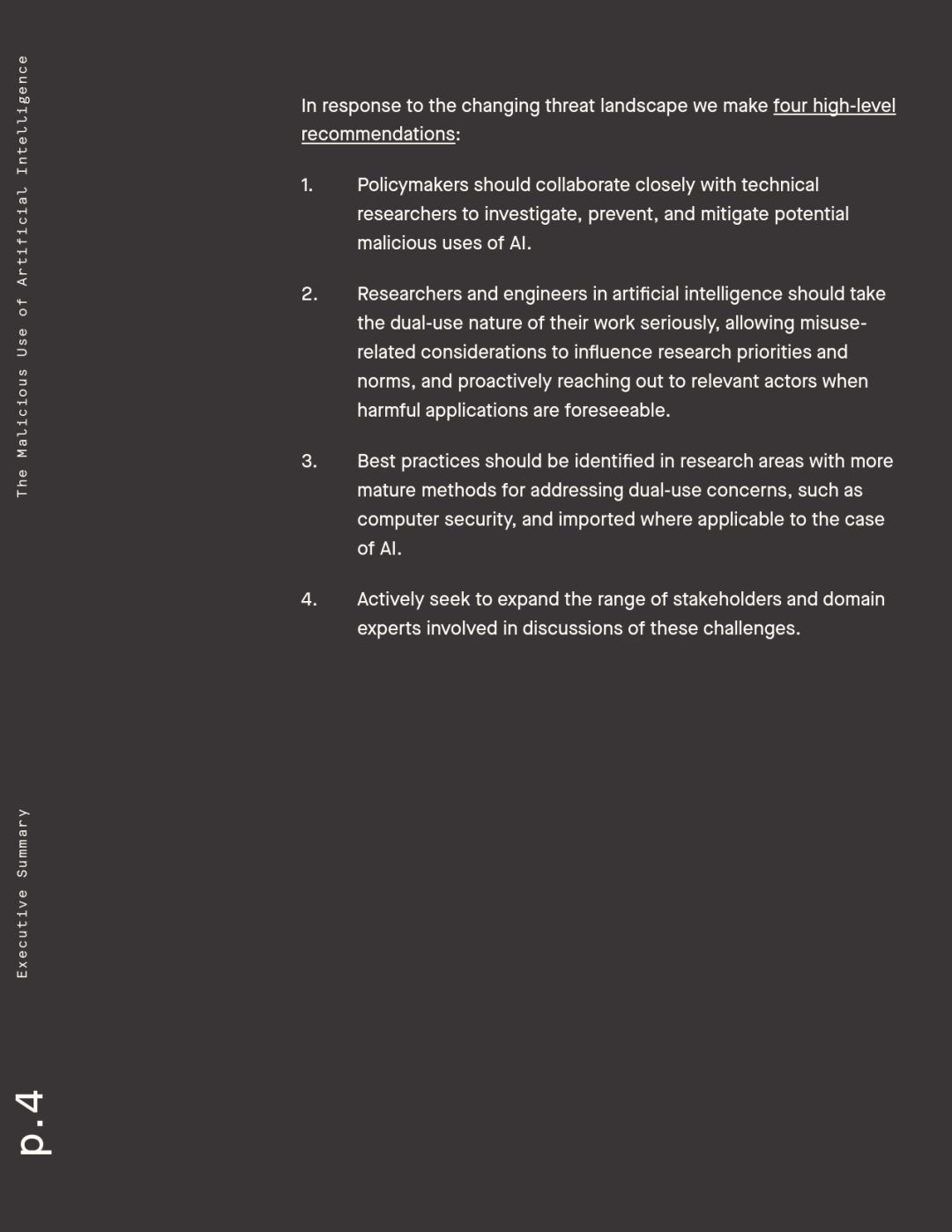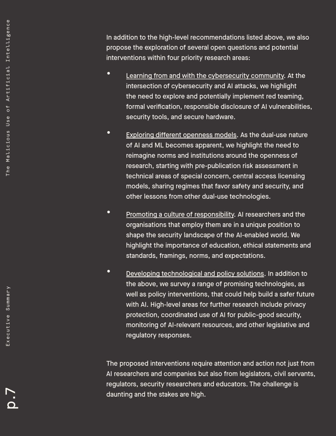 最后,这份报告提出一系列建议,包括将人工智能视为 "军事兼商业"科技加以管制。它也呼吁人工智能界的学者,要对发表他们的研究成果保持谨慎,静待其他学者研拟出因应风险的办法。这位学者也坦陈,"最终,我们发现的问题比能解决的多。"