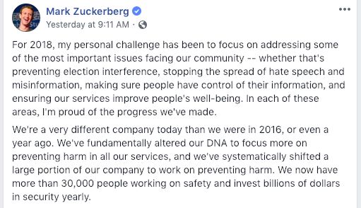 Facebook 在“阻止人们利用它干预大选、停止传播仇恨言论和错误信息、确保人们能掌管自己的信息,以及保证 Facebook 的服务能提高人类福祉”方面,取得很大进步。“在这每一件事情上,我对我们取得的进步感到骄傲”。