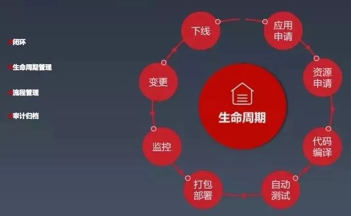 比如我们在发布应用的时候,从应用的申请、资源的申请,到代码编译、测试,甚至到监控,变更,一直到这个机器下线、应用下线,我们都整合到 DevOps 平台,这样就做到了闭环。