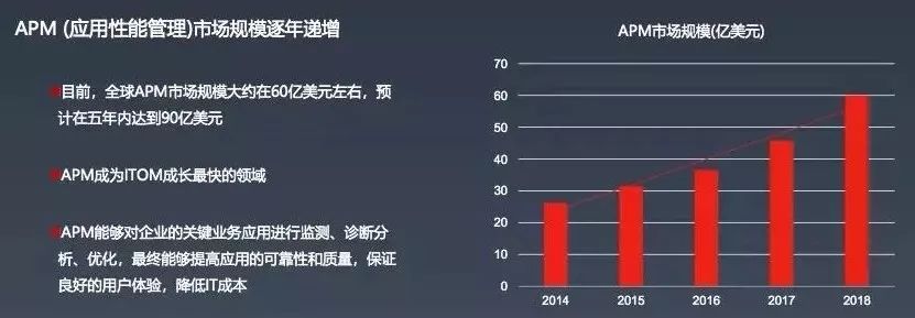 APM 是近几年才兴起。据 Gartner 统计,APM 是整个 ITOM,甚至 ITSM 领域里增长最快的一个领域,有很广阔的市场前景,目前全球 APM 市场规模大大约为 60 亿美元,预计在 5 年内可以达到 90 亿美元。目前国内外的 APM 厂商已经比较多,正处于群雄逐鹿的阶段。