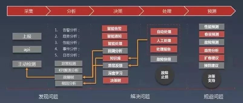 前面已经有提及,AIOps 主要从发现问题、解决问题、规避问题三个方面来设计和实施。对于发现问题,很多在做 AIOps 的厂商都已经做的很完善了,包括异常检测,根因分析、智能告警、性能分析、事件分析、日志分析等。