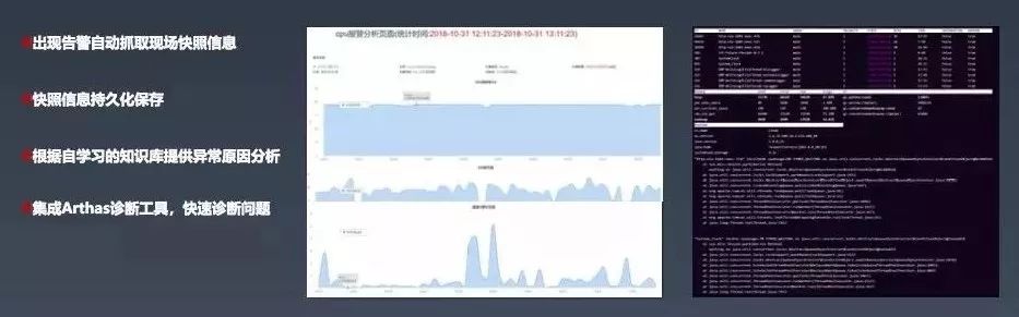 在故障处理方面我们比较好的一个实践是快照机制。当监测到异常时系统会在触发报警的时刻立即触发快照,在系统上抓一些现场信息,现场快照信息包含:占用 CPU 较高的线程排名、JVM 内存堆栈信息、网络信息以及磁盘 IO 信息等。