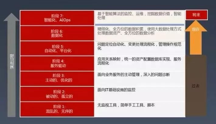 关于智能运维的发展,我们将发展过程分为以上七个阶段。前三个阶段从手工运维发展到面向业务服务的主动管理。第四个阶段是服务驱动,该阶段建立了统一的 CMDB 系统,这时候我们需要服务的流程化来支撑整个运维体系,比如一些工单系统等等。