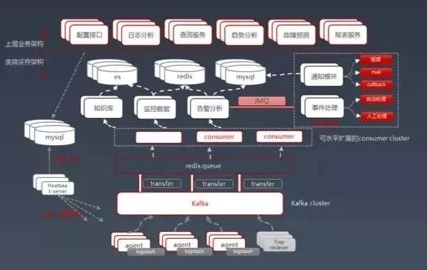 那我们是如何从架构方面落地实现的呢?我们将整体系统架构拆分为底层数据处理架构和业务架构,底层数据处理架构负责监控数据的采集、数据清洗、校验、告警和通知操作。业务架构负责监控数据统计分析、展现。