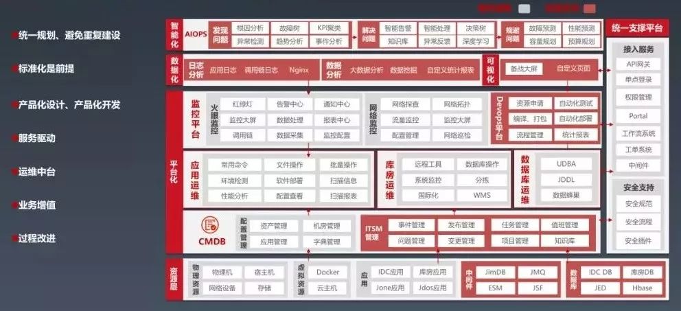 我觉得第一点,就是统一规划,避免重复建设。很多公司发展到一定的规模之后,由于前期运维体系的发展规划不足,可能每个部门都有自己的一套运维或者监控平台,平台繁多就容易形成数据孤岛,导致数据串不起来,无法做全面的数据分析工作。