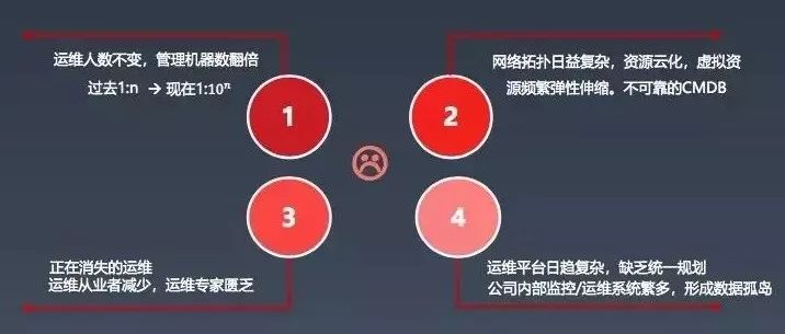 运维平台日趋复杂。很多公司发展到一定的规模之后,因为前期的发展规划不足,可能每个部门都有自己的运维或者监控平台,平台繁多就容易形成数据孤岛,这样就造成了研发人员在使用的时候非常不便。