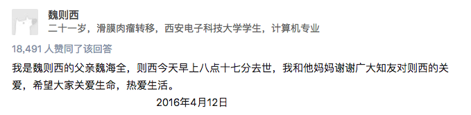 “我是魏则西的父亲魏海全,则西今天早上八点十七分去世,我和他妈妈谢谢广大知友对则西的关爱,希望大家关爱生命,热爱生活。”