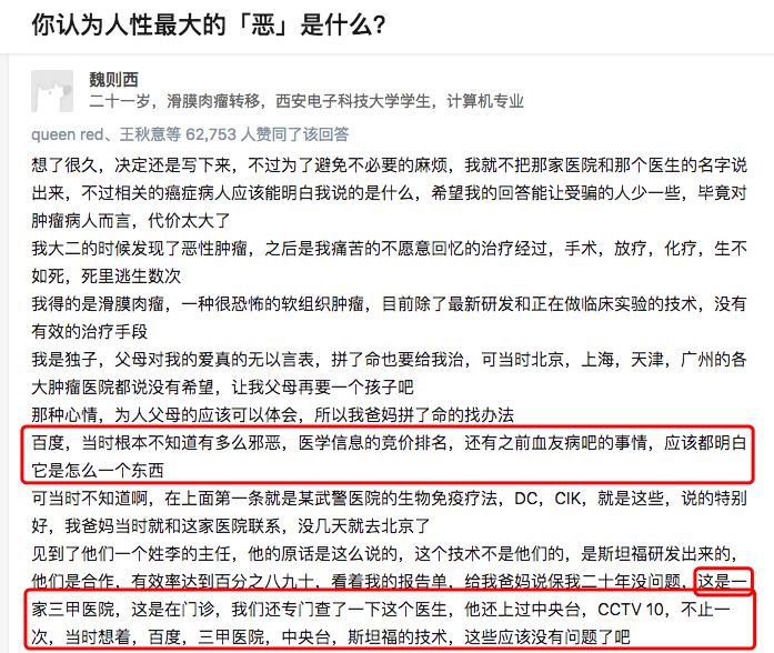 在回答中,魏则西写下“当时想着,百度,三甲医院,中央台,斯坦福的技术,这些应该没有问题了吧。”