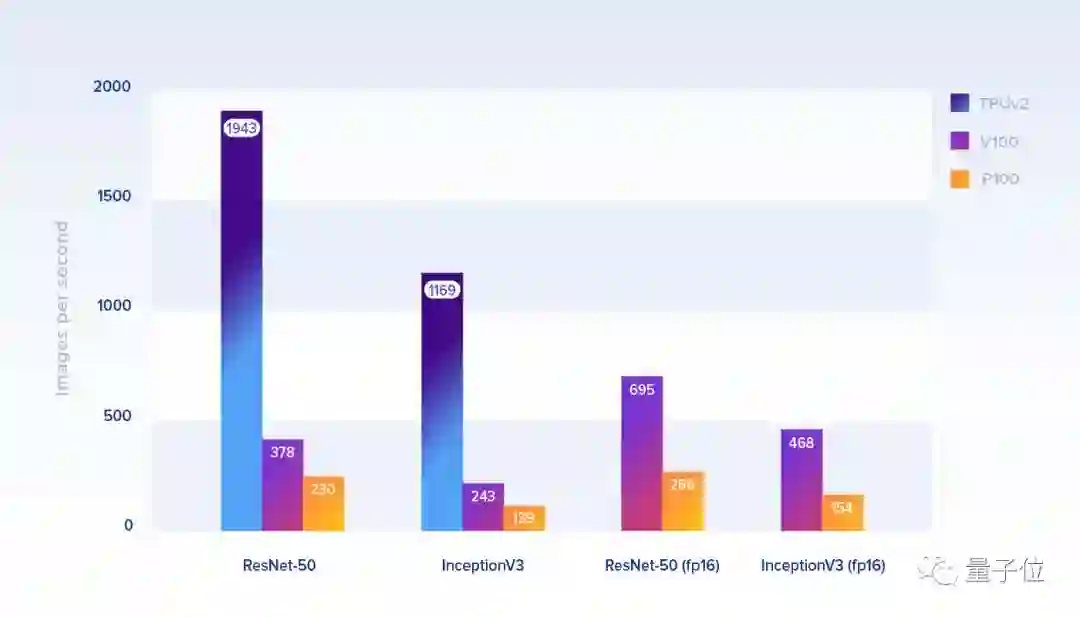 在ResNet-50上,单个Cloud TPU比单个P100快8.4倍,比V100快5.1倍。对于InceptionV3,结果差不多,分别快8.4倍和4.8倍。另外,如果把精度降低(fp16),V100的提速更加明显。