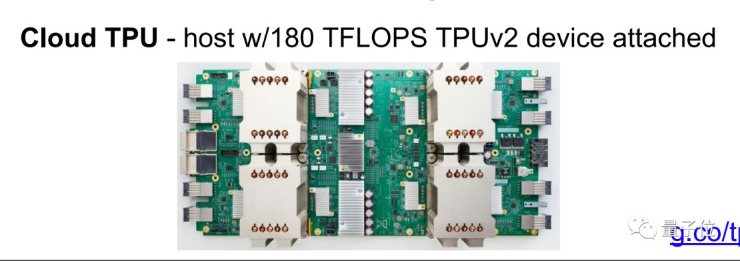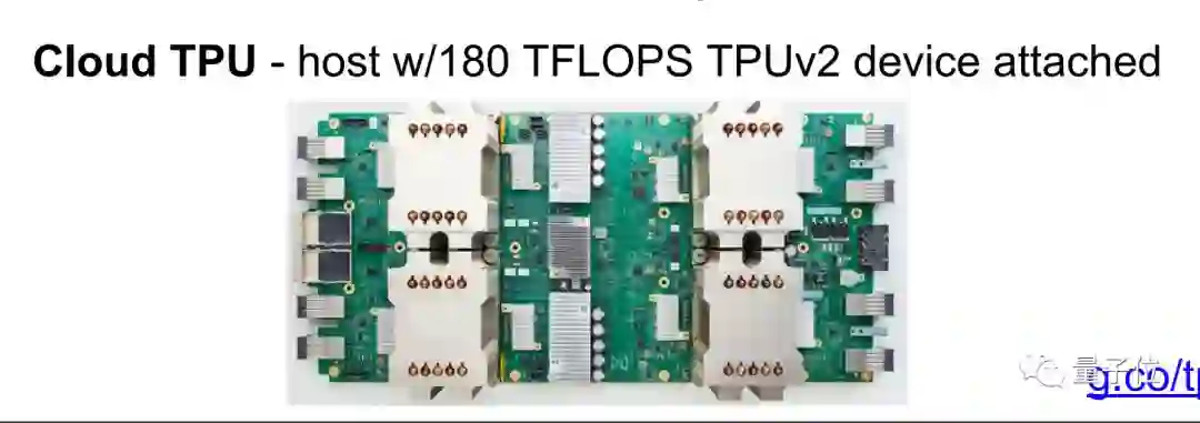 根据Jeff Dean此前放出的PPT显示,每个Cloud TPU由四个TPUv2芯片组成。每个芯片有16GB内存和两个内核,每个内核有两个矩阵乘法单元。
