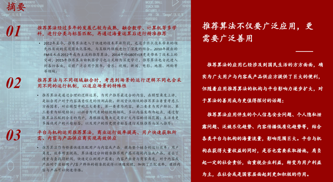 平台与机构运用推荐算法,商业运行效率提高、用户快速获取所需、内容与产品供应商实现高效供应