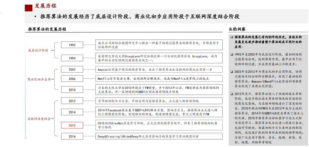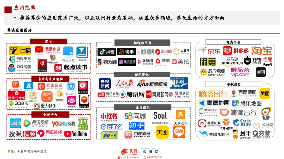 2012年至今,推荐算法进入了快速的技术革新阶段,也逐步依托技术带来的领先性能实现商业化落地,与互联网领域进行了深度的结合。2010年提出的FM技术在2012年成为主流的推荐算法,2014年的GBDT+LR更是带来了技木上的突破,2015年推荐算法由机器学习也正式转为深度学习。推荐算法也自此进入到各行各业,目前广泛应用于图书、音乐、视频、新闻、电影、地图、网购等等领域: