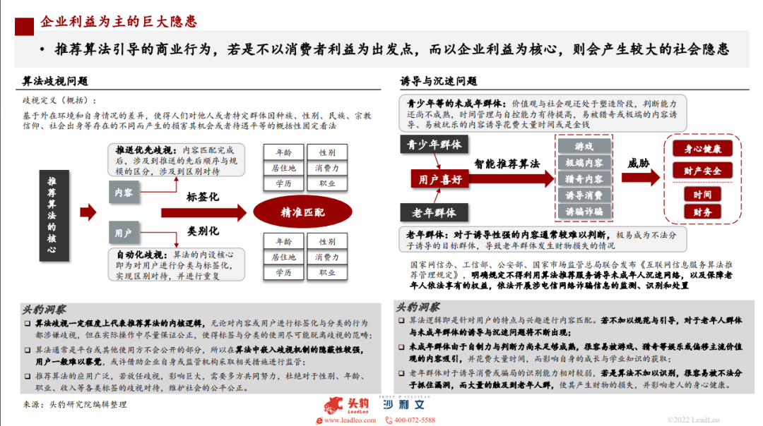 推荐算法应用伴生的个人信息安全问题、个人隐私泄露问题、泛娱乐化趋势、内容传播低俗化趋势等,结合各类平台与机构的海量流量,影响范围巨大。平台与机构在获得大量收益的同时,是否也需要采取措施,肩负起一定的社会责任,由重视企业利益,转变为用户利益为主,在社会或是国家层面起到更加积极的作用。