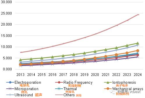 透皮技术的创新,如微针或机械阵列纳入透皮贴片,也让这个市场在未来几年变得有利可图。目前改善药物透皮吸收的技术,包括化学促渗剂、电穿孔技术、微针技术、离子导入技术、超声促渗技术、激光促渗技术和热穿孔技术等。