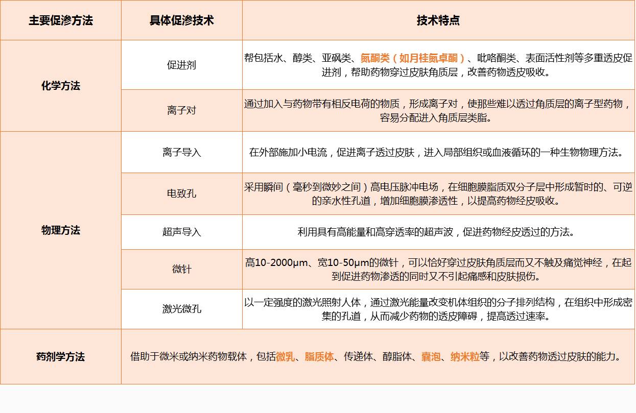 由于皮肤角质层对药物透皮吸收的屏障作用,使得大多数药物,即便是一些剂量低、疗效高的药物,其透皮速率和渗透量也难以满足治疗的需求,是开发透皮给药制剂的重大障碍。因此,透皮给药系统的促渗方法成为了行业内研究的焦点。目前常用的促渗方法包括:化学方法、物理方法和药剂方法。