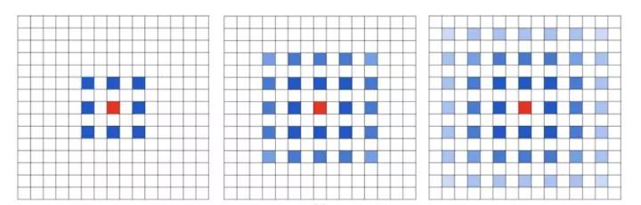 一个简单的例子: dilation rate [1, 2, 5] with 3 x 3 kernel (可行的方案)
