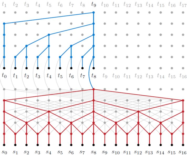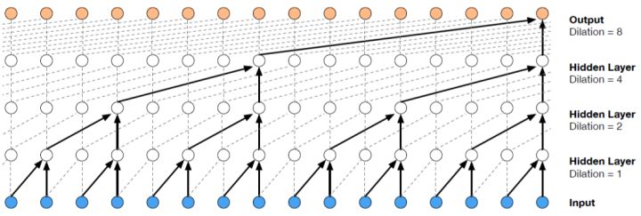 dilated的好处是不做pooling损失信息的情况下,加大了感受野,让每个卷积输出都包含较大范围的信息。在图像需要全局信息或者语音文本需要较长的sequence信息依赖的问题中,都能很好的应用dilated conv,比如图像分割[3]、语音合成WaveNet[2]、机器翻译ByteNet[1]中。简单贴下ByteNet和WaveNet用到的dilated conv结构,可以更形象的了解dilated conv本身。