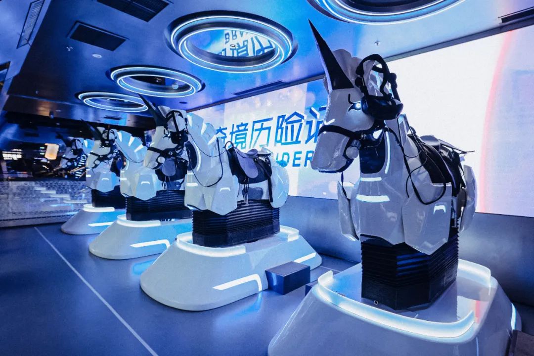 虽然西游是古典传统故事,但超体空间的整体风格还是偏科幻时尚和艺术光影。在这里,玩家能体验的战斗不仅仅是金箍棒、白龙马和神妖斗法,还有士兵、VR 摩托车和大空间真人VR电竞和人机对战游戏。