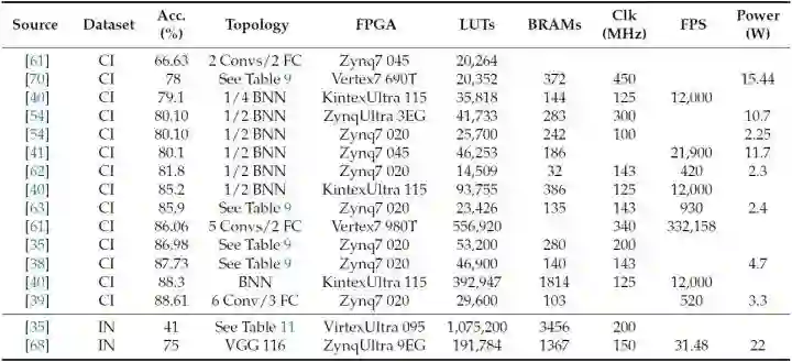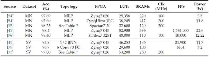 相比于传统的CPU,FPGA在硬件架构设计方面很灵活,可以支持bitswise的高效运算,而且功耗很低,其对应的终极版的专用集成电路ASIC更是如此,可以比FPGA运算更高效,更节能。目前用FPGA设计AI加速器基本都是以Xilinx的器件和开发工具为主,而他们也为二值化神经网络专门设计了一款架构FINN,开发者可以利用高层次综合工具(HLS),用C语言进行开发,直接将二值化模型部署到FPGA上,下图是一些对比结果。而Intel的Accelerator Architecture Lab也为BNN设计了一款layer accelerator的ASIC,不过并没有找到很多的相关数据,就不赘述。