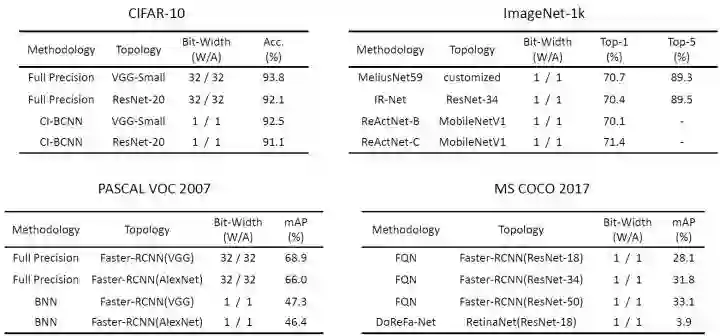 由于BNN的模型实在是太多,而每一篇论文的实验结果也非常丰富,故我从两篇综述中截取出CIFAR10,ImageNet,PASCAL VOC2007和MS COCO2017最好的一些结果,如下所示:(注意:其中MS COCO2017的结果我似乎没有在论文原文中找到依据,所以大家就图个乐,不要较真)