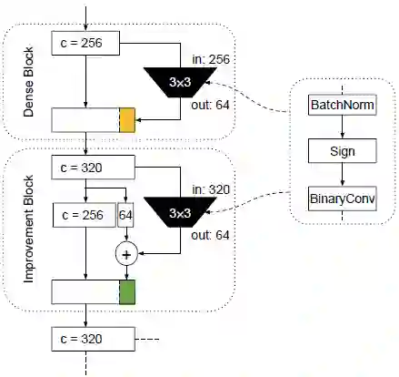话题转回来,MeliusNet根据用shotcut和concat增强Quality和Capacity的指导思想设计了两个二值友好的模块,如下图所示,一个是Dense Block,另一个是Improvement Block,这两个模块在网络中每次都是交错出现,在整个信息流中不断地增强二值化feature map的信息表达,从而提升精度。这篇论文除了这个核心思想之外,还提出了一个我觉得比较有意思的思路,那就是二值化网络应该有一套自己的网络结构,这种二值化友好结构的效果要优于相似FLOPs下全精度模型二值化后的结构,并且做了相应的实验进行验证,通俗地来讲就是倡导大家要走二值化特色社会主义道路。